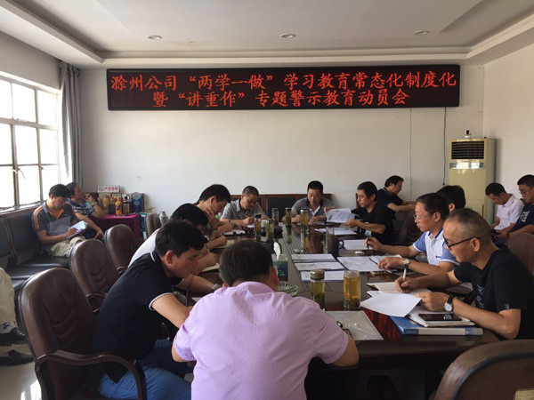 7月18日上午,滁州市公司召開(kāi)全市“兩學(xué)一做” 學(xué)習(xí)教育常態(tài)化制度化暨“講重作”專(zhuān)題警示教育動(dòng)員會(huì),各縣(市)公司黨政負(fù)責(zé)人、市公司部門(mén)負(fù)責(zé)人以上人員及黨員、預(yù)備黨員、入黨積極分子參加了會(huì)議。會(huì)議由市公司副經(jīng)理、副局長(zhǎng)王春雷同志主持。