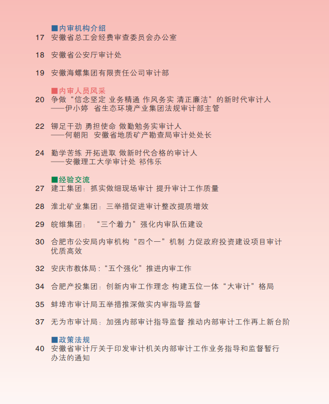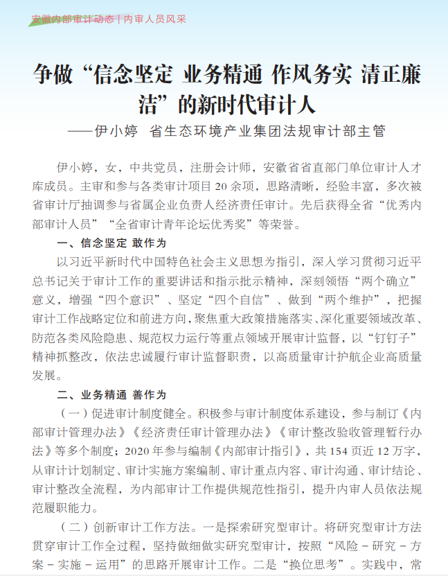 11月14日,集團(tuán)公司法規(guī)審計部主管伊小婷同志被省審計廳編印的《安徽內(nèi)部審計動態(tài)》第3期——“內(nèi)審人員風(fēng)采”欄目宣傳報道。