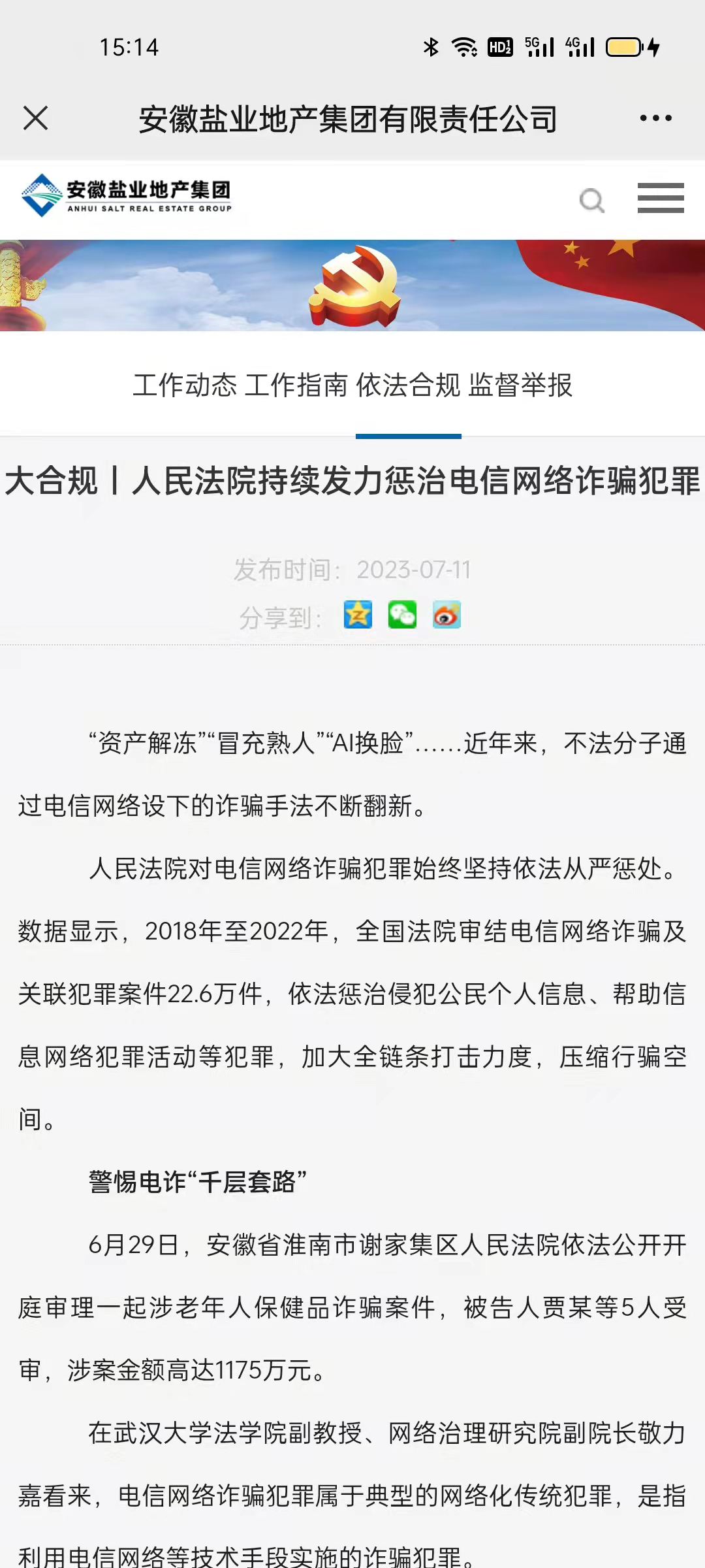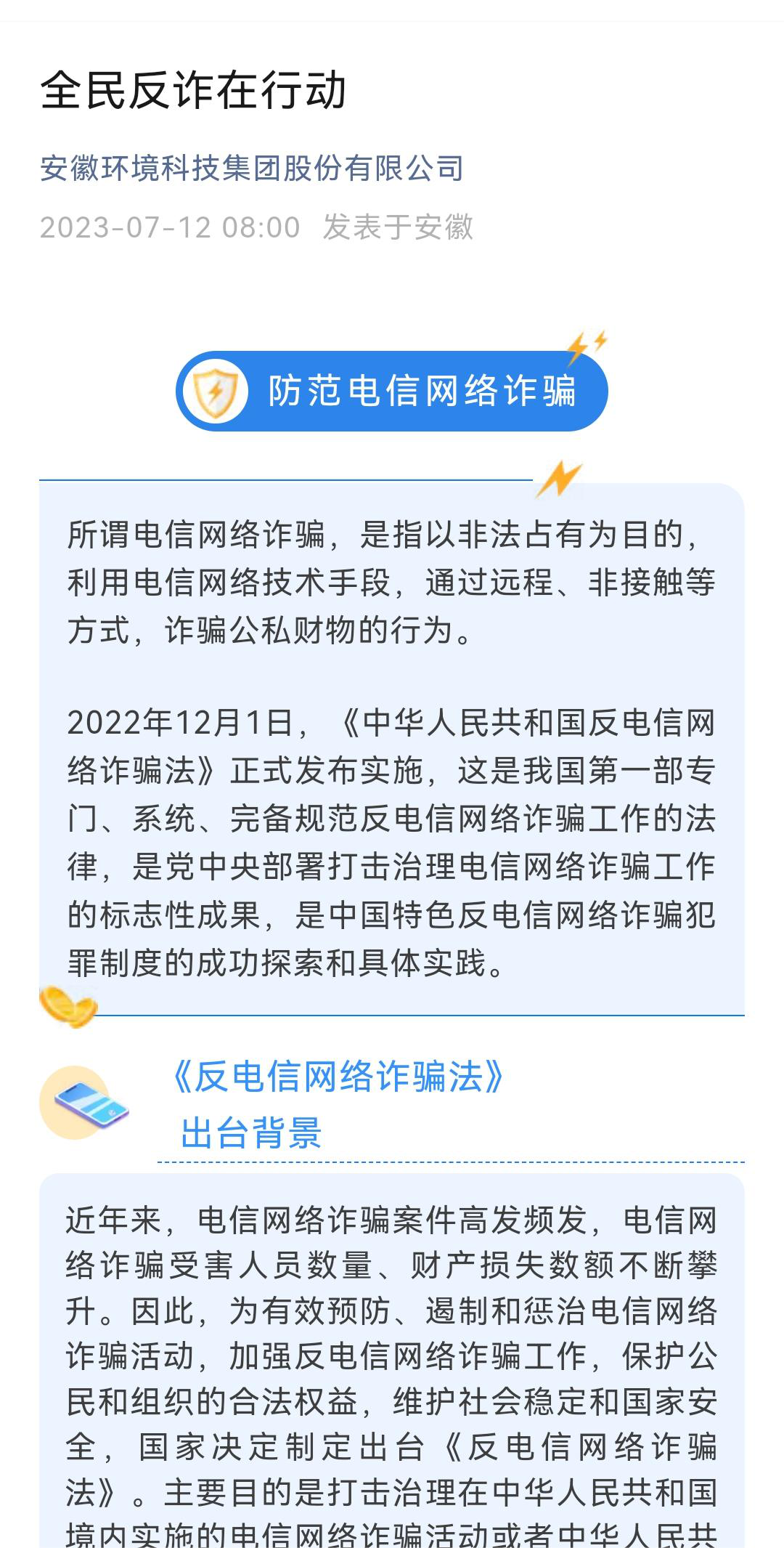 環(huán)境科技集團(tuán)、省健康養(yǎng)老、徽鹽金融等公司通過印制各類反詐宣傳單、宣講防范電信詐騙安全知識(shí),在公眾號(hào)發(fā)表普法文章等形式,號(hào)召全體員工增強(qiáng)防范意識(shí)。