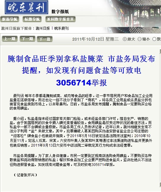晨刊訊每年冬季都是腌制咸菜、咸肉等食品的旺季,這一季節(jié)居民用戶和食品加工企業(yè)用鹽量在逐漸倍增,而這也讓一些不法分子看到了“商機(jī)”,將各類工業(yè)用鹽或劣質(zhì)鹽分拆包裝冒充食鹽賣到市場上,以牟取暴利。日前,市鹽務(wù)局發(fā)布提醒,腌制食品一定要購買合格的食用碘鹽。