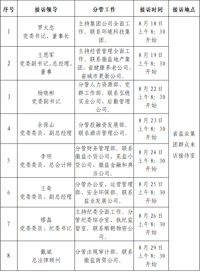 根據(jù)工作安排,現(xiàn)就省鹽業(yè)集團(tuán)領(lǐng)導(dǎo)班子成員8月份接待省鹽業(yè)系統(tǒng)職工群眾來訪安排公示如下: