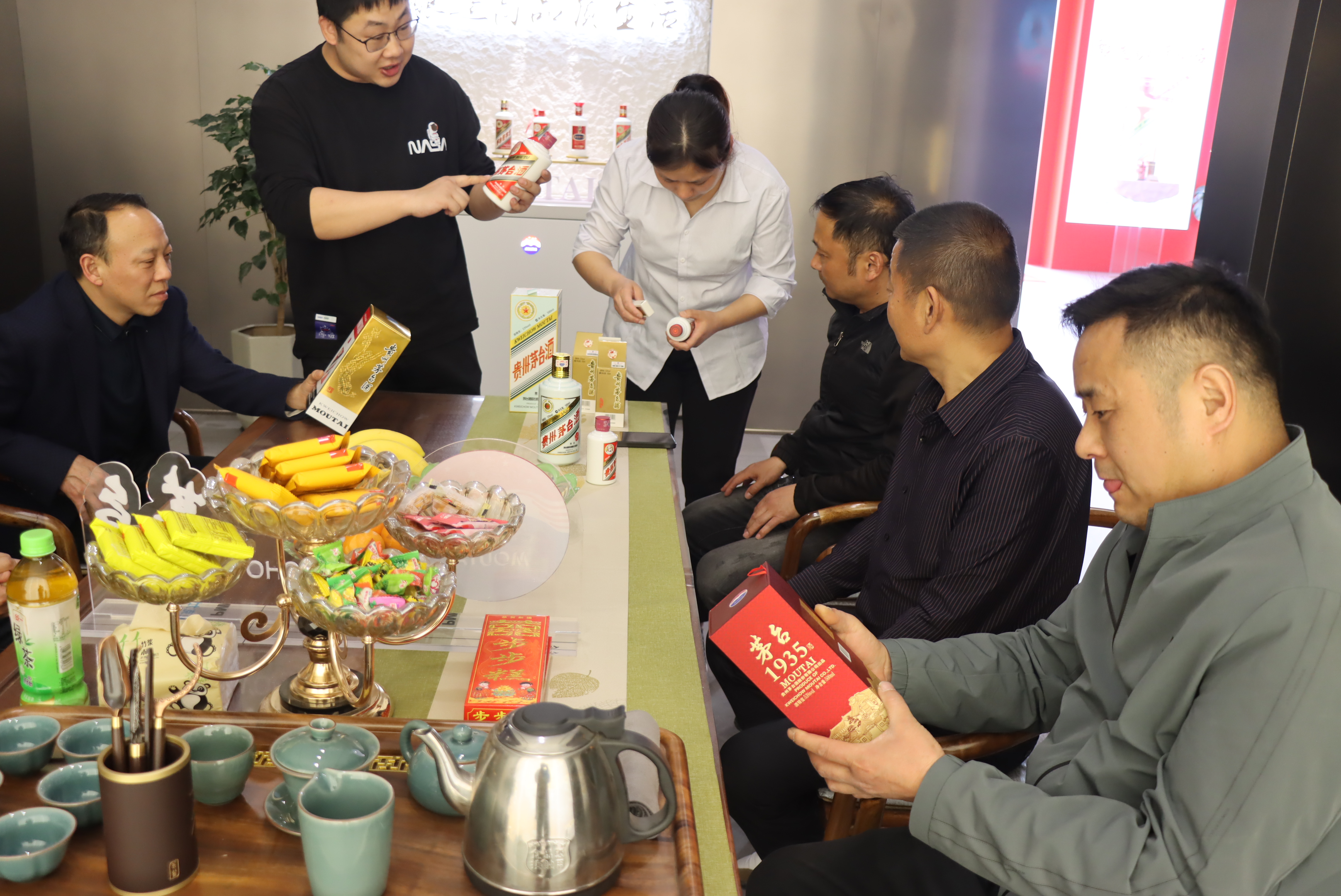 為客戶講解茅臺(tái)真?zhèn)舞b別方法,市面上出現(xiàn)不少整箱插花酒、真瓶針孔吊瓶酒、膠帽酒包裝制假售假的案例,面對(duì)先進(jìn)的造假技術(shù),廣大消費(fèi)者們要擦亮眼睛,可以通過包裝、瓶身、防偽標(biāo)識(shí)等辨別真假,真茅臺(tái)的包裝彩盒質(zhì)地較硬,印刷精美,顏色均勻,部分文字及圖案有明顯的凹凸感,通過專用識(shí)別器觀察瓶蓋,真酒的帽套頂部呈亮黃色,上有黑色浮點(diǎn),而且可以隨帽套的轉(zhuǎn)動(dòng)在亮黃色背景范圍內(nèi)漂移。在購(gòu)買茅臺(tái)產(chǎn)品時(shí)要通過i茅臺(tái)APP、專賣店、自營(yíng)店等正規(guī)渠道購(gòu)買茅臺(tái)酒,并保存發(fā)票,以便日后有據(jù)可查,憑發(fā)票舉報(bào)、索賠。