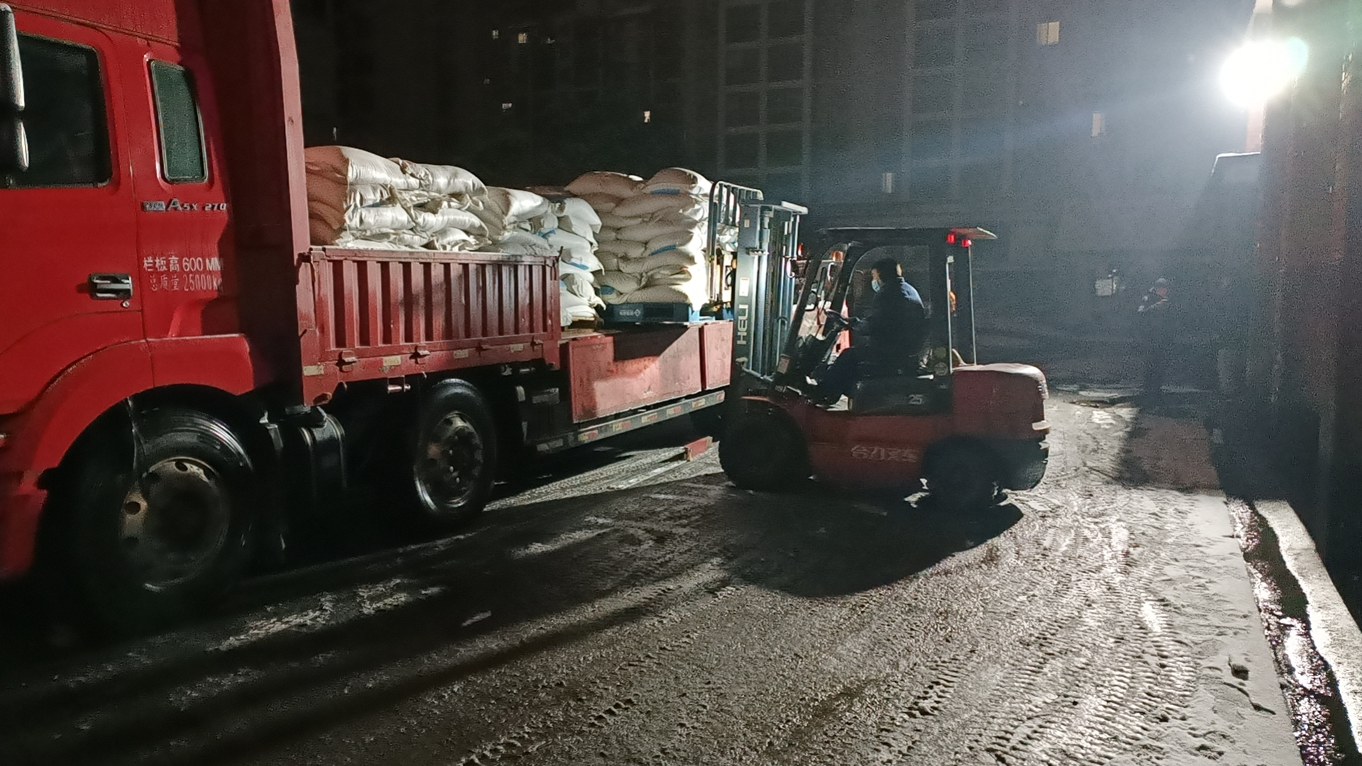 公司領(lǐng)導(dǎo)班子親赴倉(cāng)儲(chǔ)配送一線指揮調(diào)度,全市一市五縣鹽業(yè)干部職工眾志成城抗冰雪,頂著風(fēng)雪嚴(yán)寒,冒著雨雪和刺骨的寒風(fēng)奮戰(zhàn)在保供一線。截至2月4日下午,合肥鹽業(yè)共出動(dòng)配送車輛200臺(tái)次、配送人員100余人次、累計(jì)發(fā)出融雪鹽1500余噸,為清除全市各大公共交通道路積雪提供了有力保障。同時(shí),將倉(cāng)庫(kù)內(nèi)過(guò)期及破損小包裝鹽品拆袋裝換,為此次保供任務(wù)轉(zhuǎn)化融雪鹽品近20噸。4日晚上11點(diǎn)臨時(shí)接到市政部門緊急用鹽,公司搬運(yùn)人員在已連續(xù)作戰(zhàn)48小時(shí)的情況下,仍第一時(shí)間從家中趕至公司,奮戰(zhàn)在融雪鹽保供一線。